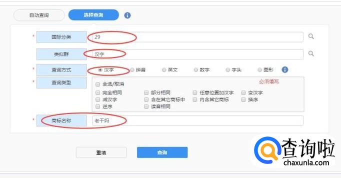 随便输入一个知道的商标,比如老干妈,然后点击查询,结果是完全相同,说明这个商标已经有人注册了。