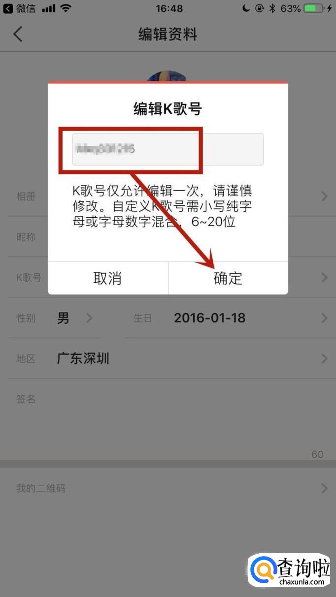 然后输入你的新的k歌号并点击确定就可以了。