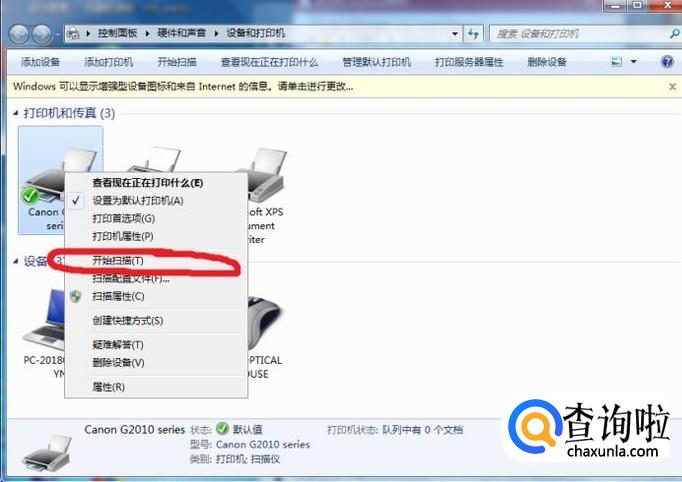 打开“设备和打印机”,在你的复印机图标点击右键,选择“开始扫描”,将文件放入扫描台,点击“扫描”即可完成对文件的扫描工作