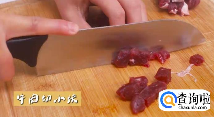 首先,将准备好的牛肉切成小块,再把胡萝卜和洋葱切成丁。