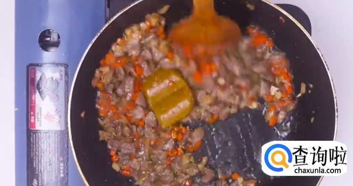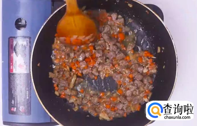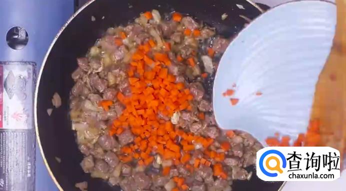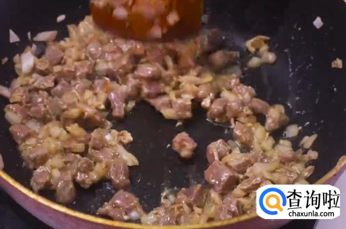 接着,把调好料的牛肉块倒进去,和洋葱一起翻炒至肉变色。