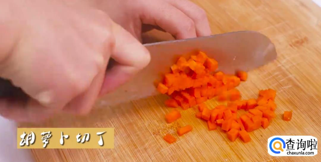 然后,继续往锅里加入萝卜丁,翻炒混合均匀后,加入50ML的清水。