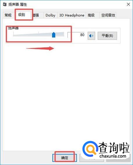 弹出的界面,我们点击级别,然后将声音向右滑动调大,之后点击确定就可以了。