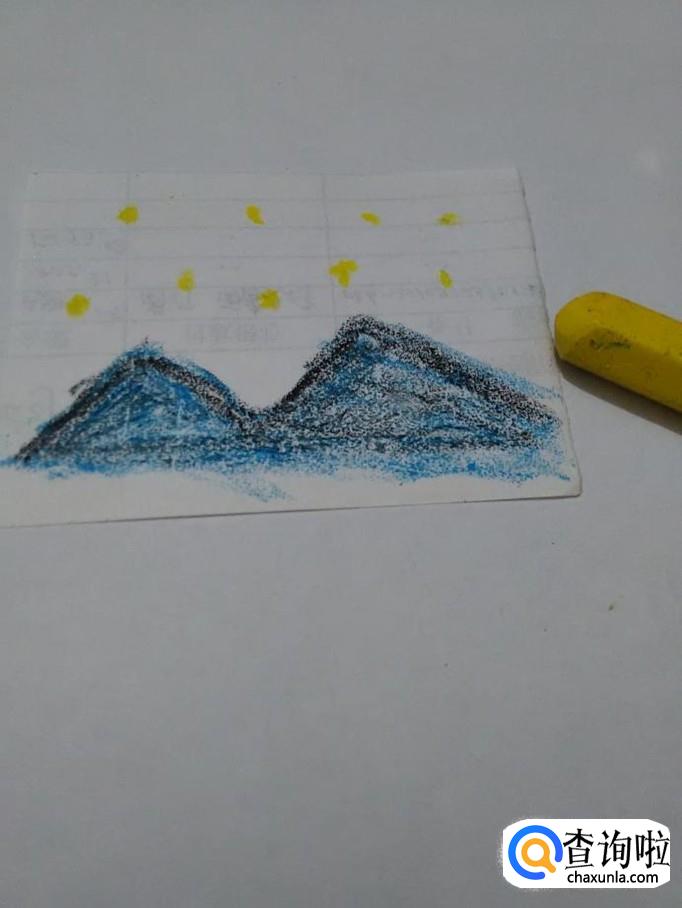 用黄色油画棒在大山上面点一些黄色的圆点,表示星星。