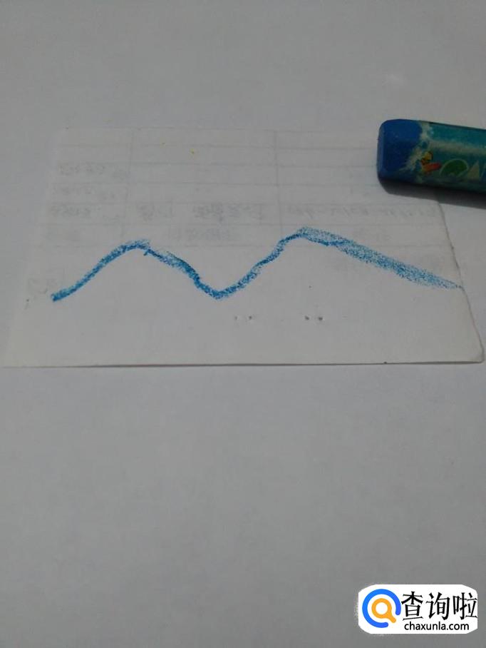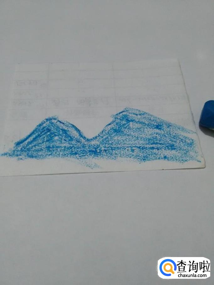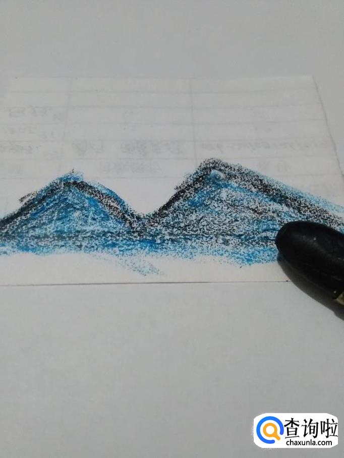 先用蓝色油画棒在纸上画一个M的形状,表示大山。