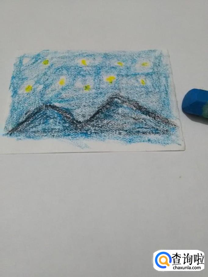 用蓝色油画棒在星星周围涂满颜色,表示夜空,星空就画完了。