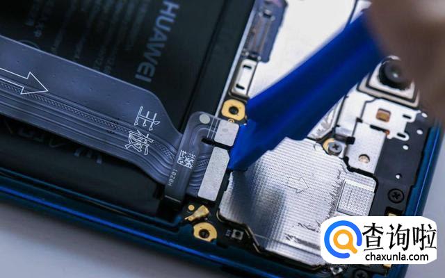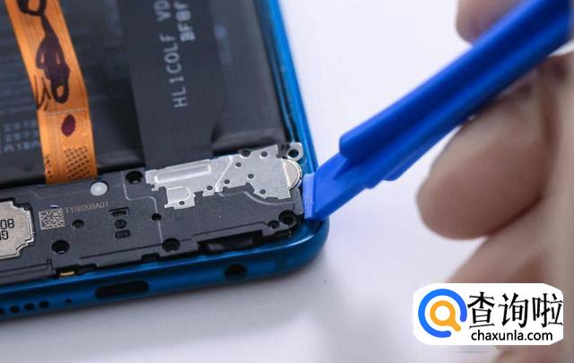 荣耀10这次采用了一个长条压片把电池FPC、显示FPC、副板FPC全部压住,需要用工具先把长条压片撬出来,如图所示。