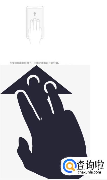 三指上滑启动分屏:打开应用后,三指从屏幕内上滑启动分屏,上滑操作不要从屏幕底部边缘启动。