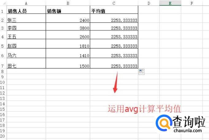 接下来我们添加平均值列,运用avg函数计算出销售额的平均值,如下图所示