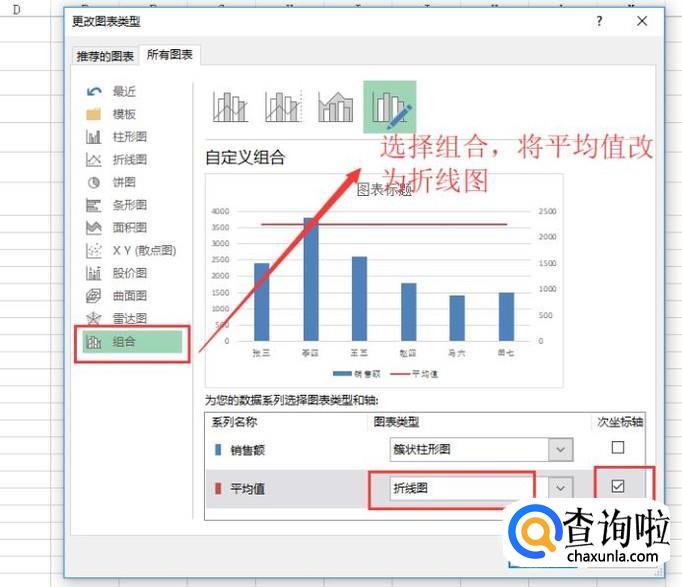 在弹出的更改图表类型界面中选择组合选项,如下图所示,并且将平均值的图表类型选择为折线图,然后勾选次坐标轴