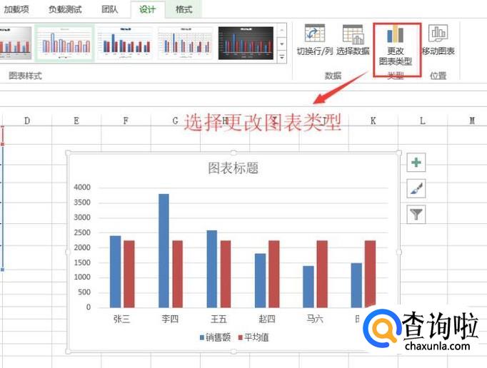 接下来我们选择柱形图,点击设计菜单下面的更改图表类型选项,如下图所示
