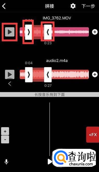 接着点击两段音轨的播放键,拖动左键和右键,把两段音频剪辑好。