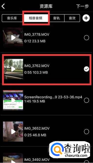 接着点击相册音频,勾选你要剪辑的音频。