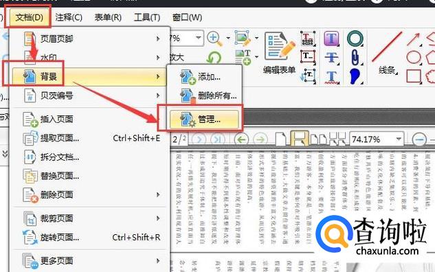 如图所示,点击最上方菜单栏中的“文档”——“背景”——“管理”。