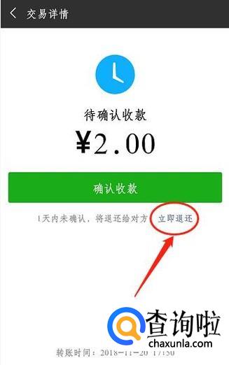 点击转款,刚点击时不会立马收款的,转账是需要二次点击才会收款到自己的钱包;打开之后我们可以看到下方有个“立即退还”,点击这个。