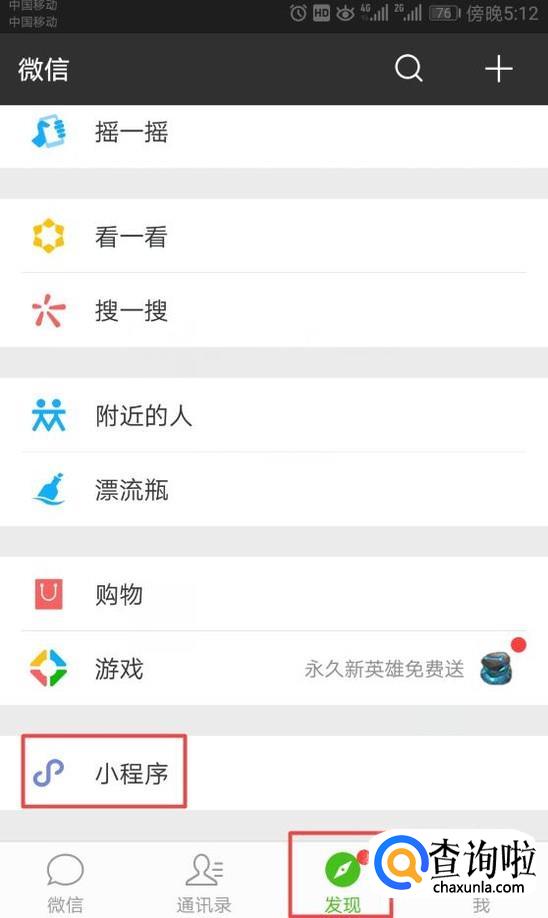 首先,我们打开我们的微信,然后我们点击发现,之后我们点击小程序;
