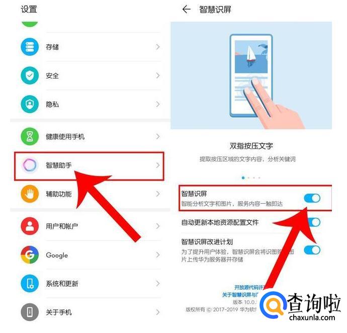 EMUI9.1开启方式:设置→智能辅助→智慧识屏→开启智慧识屏。