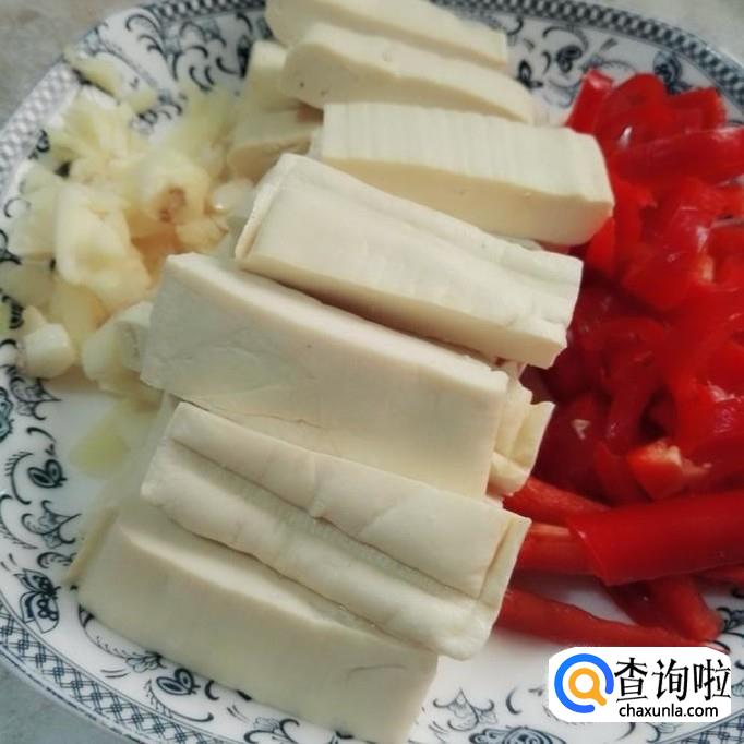 把豆腐干切成条,再把红椒去籽也切成条 ,大蒜籽用刀背拍一下,去皮再剁碎,都放在一个盘子里备用。