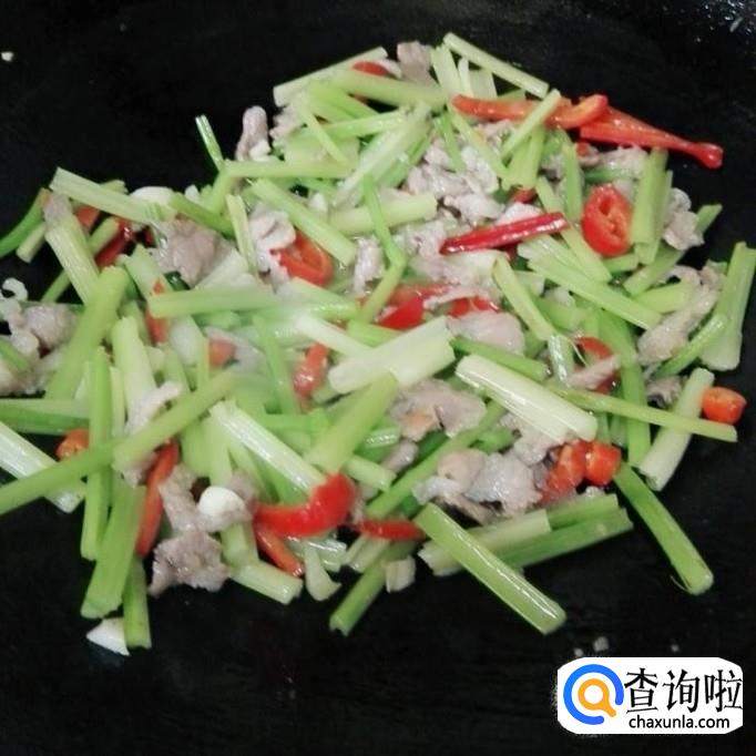 接着把芹菜和辣椒放进锅快速翻炒一分钟。