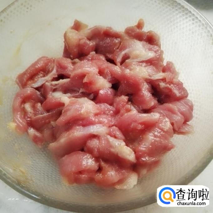 再把猪肉洗干净控水再切成丝,放生粉,蚝油,鸡粉,盐搅拌均匀后腌五分钟。