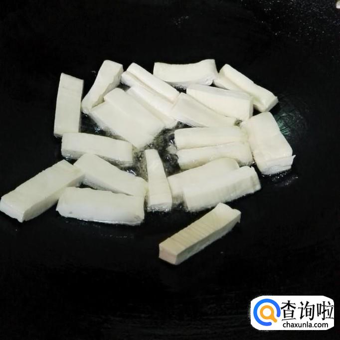 锅烧六成热,放适量花生油,先来煎豆干,豆干比豆腐好煎多了,中火煎就好。一面煎好后再翻一面煎。