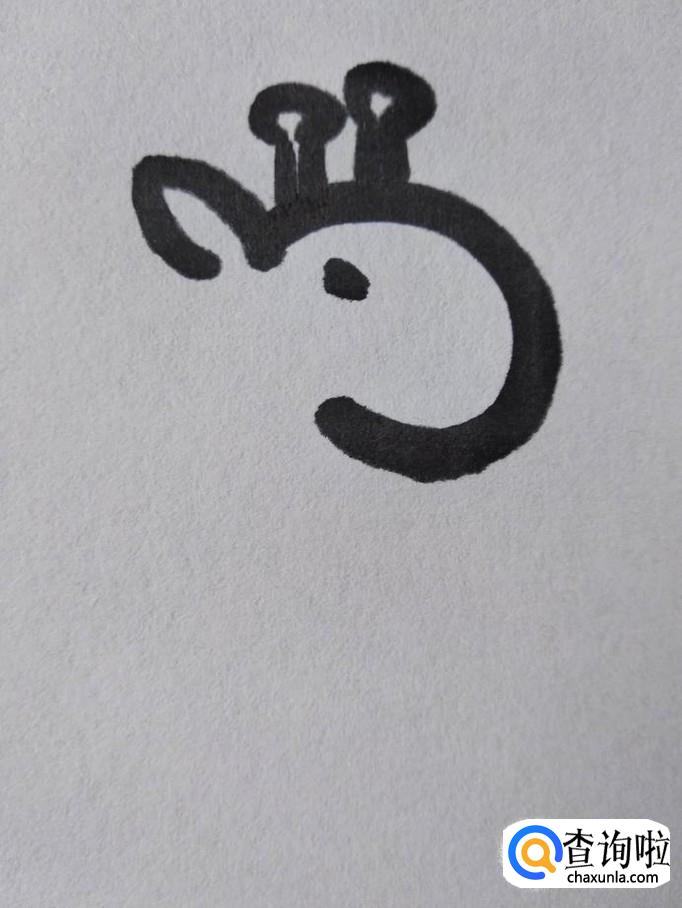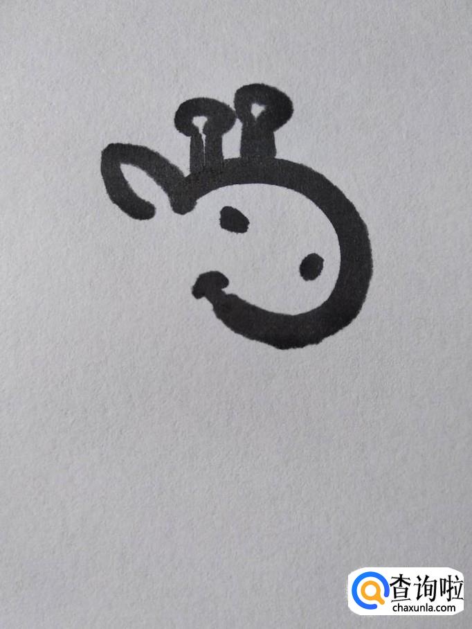 再在圆弧的左上方画出长颈鹿的犄角,犄角是两个大小相同的圆柱形,在圆柱上方各有一个直径稍大一些的圆,两部分相通。接着画出长颈鹿的耳朵,耳朵末端稍尖一些,再画出长颈鹿的眼睛鼻子和嘴巴。