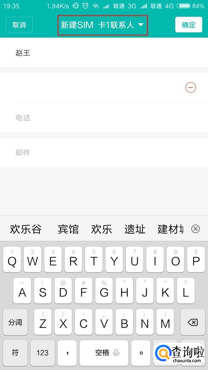接下来,需要我们填写联系人姓名,这里我们可以选择联系人的存储位置,是存储在SIM卡或者手机中。