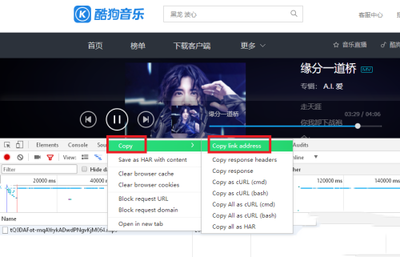 6、鼠标右击,点击mp3格式的歌曲,出现选项窗口,点击【copy】,再点击【copy link address】。