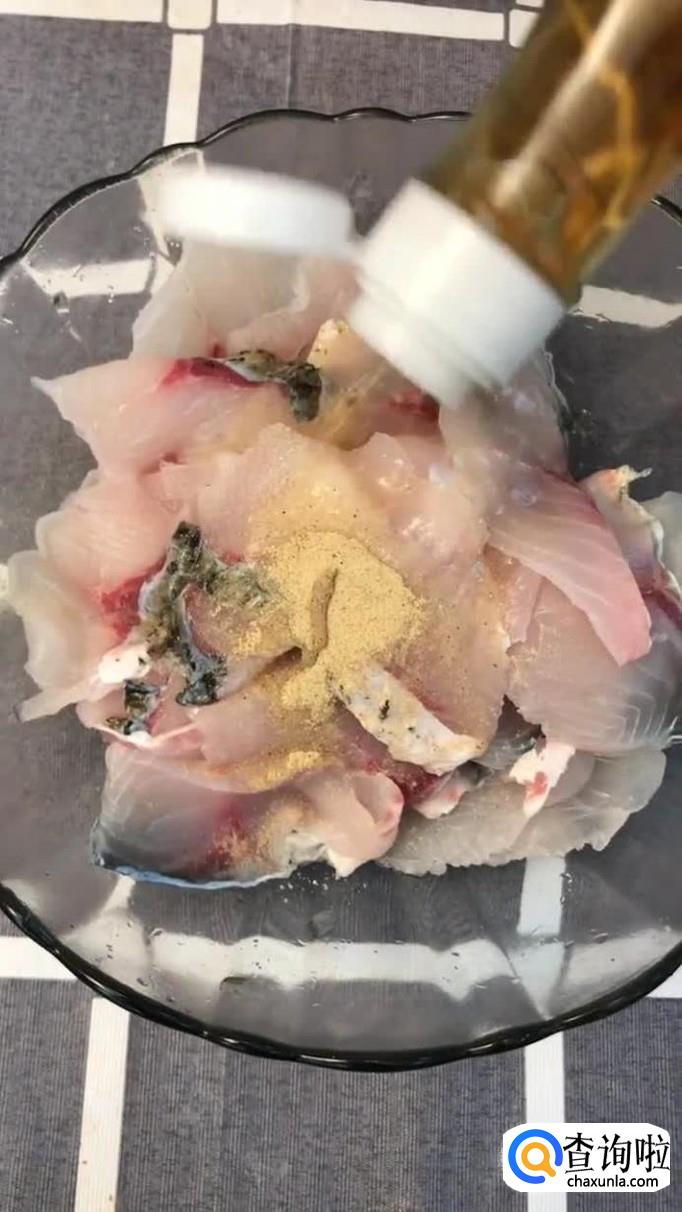 接着加入适量的盐,十三香和料酒把鱼肉抓匀,如下图所示。