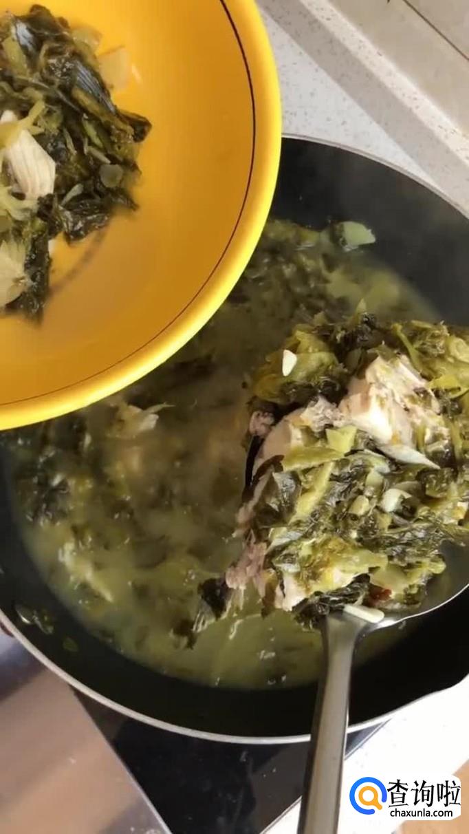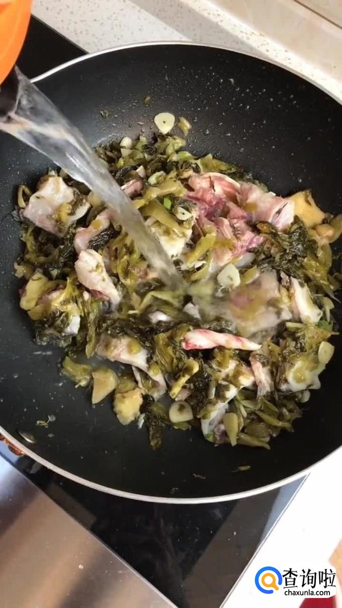 接着加入酸菜和鱼骨翻炒片刻,并加入适量的清水煮五分钟,如下图所示。