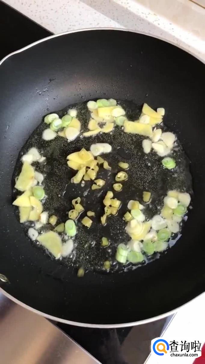 然后锅中放入适量的食用油,加入生姜,葱花和黄辣椒爆香,如下图所示。