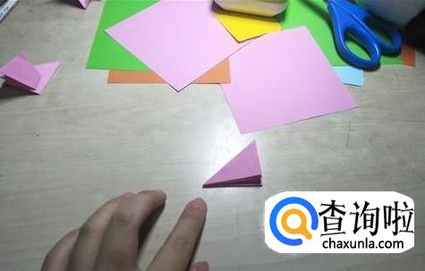 折叠好后的这个小的图形,再将沿着它最右边的那一条线用剪刀将它剪切下来。打开之后就是一个五边形的图形。