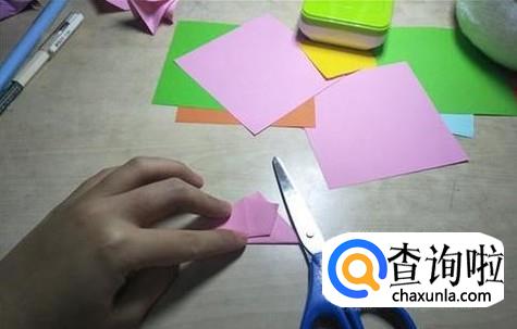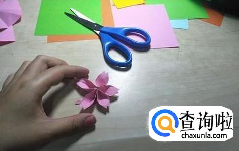 接着再将它们翻过来,拉开会看到五个比较细的边,然后再将这五个边进行整理之后把它们打开。再用剪刀将尖端部分剪成一个比较像花瓣类型的一个小口。最后再整理一下,然后一朵漂亮的小樱花就做好了。