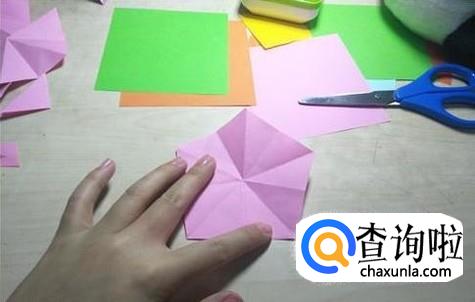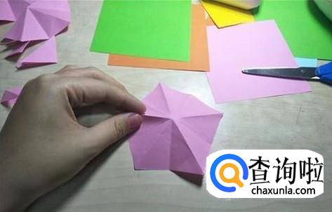 展开这个五边形图形之后,再沿着凹下去的折痕,将他们进行整理。整理之后再沿着刚刚整理的这几条折痕,将他们沿着中心的那个点进行整理重合。