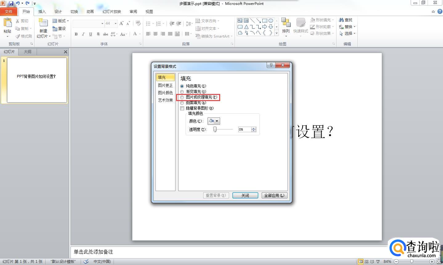 3、在弹出的“设置背景格式”窗口中选择“填充”目录下的“图片或纹理填充”。