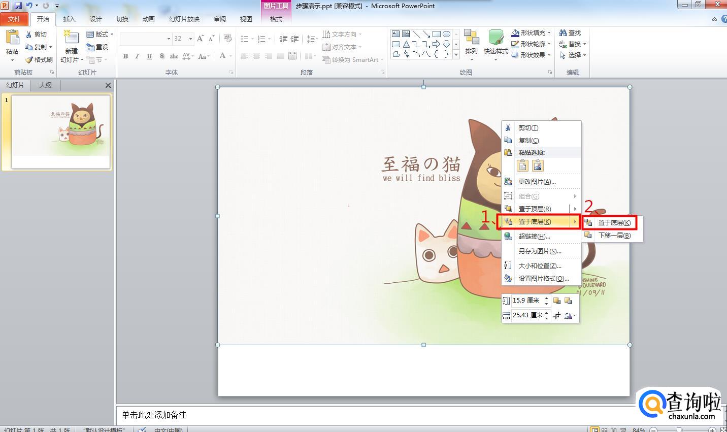 3、在图片区域中点击鼠标右键,选择“置于底层”→“置于底层”即可。