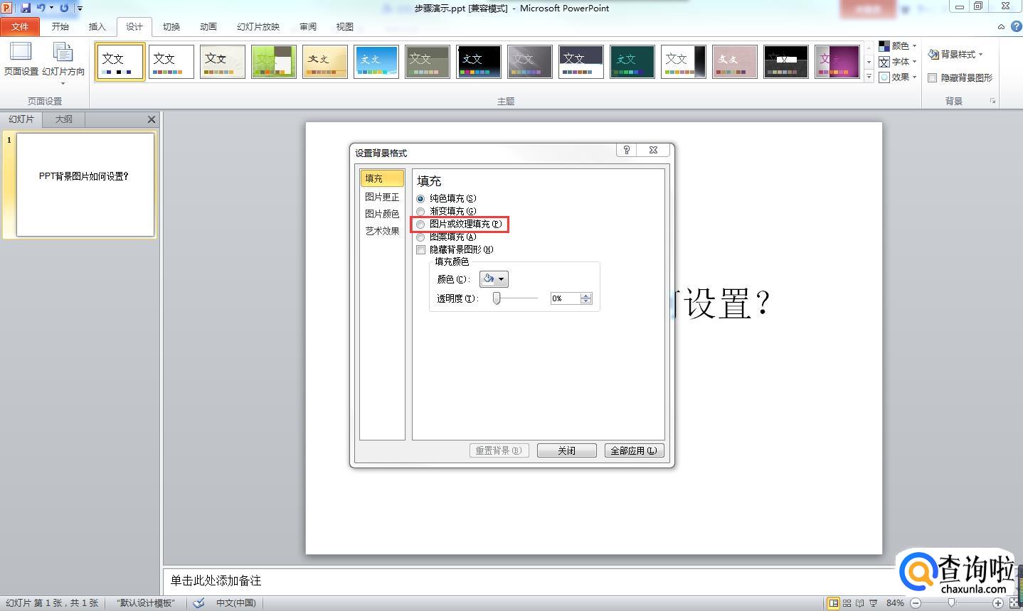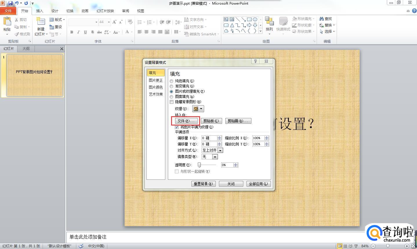 (注意:在选择“图片或纹理填充”后,系统会默认将PPT背景设置为纹理图案。)