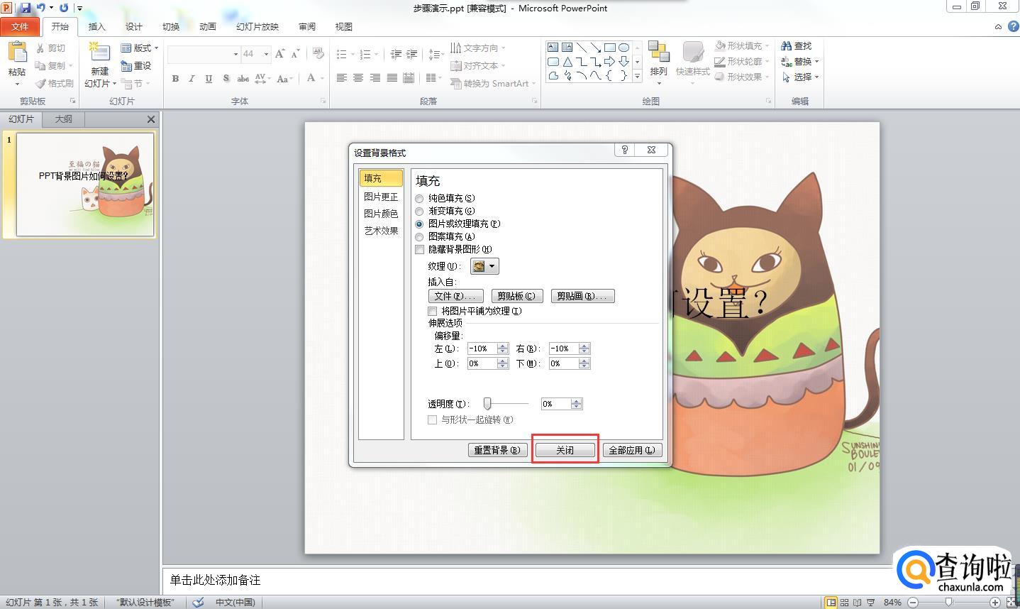 6、点击“设置背景格式”窗口中“关闭”按钮即可。