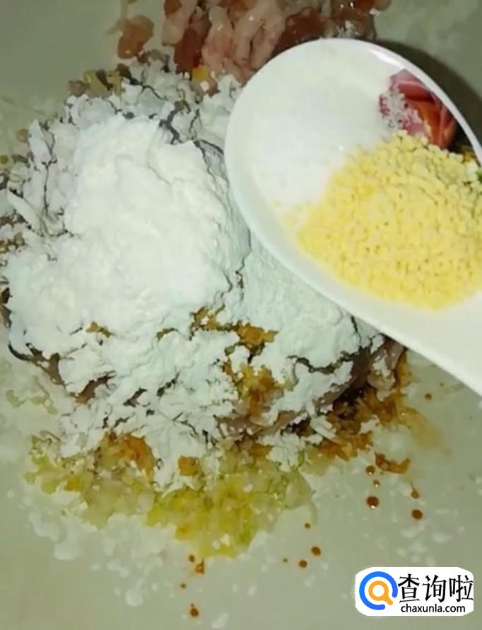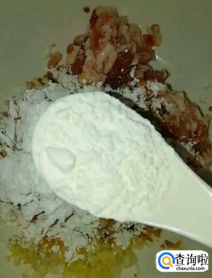 接着我们再放入两小勺的淀粉,适量的盐,鸡精,再打入一个鸡蛋,用筷子顺时针搅拌均匀
