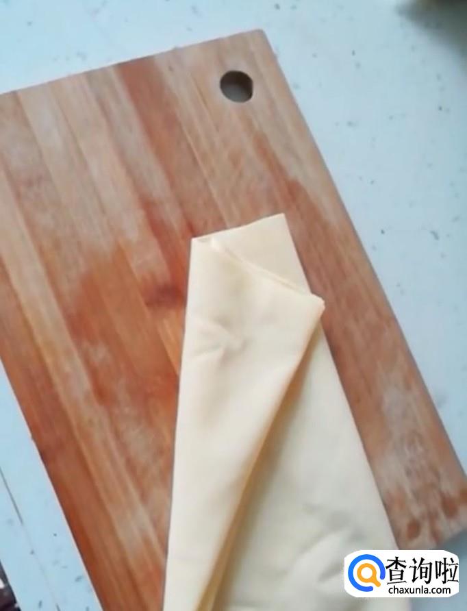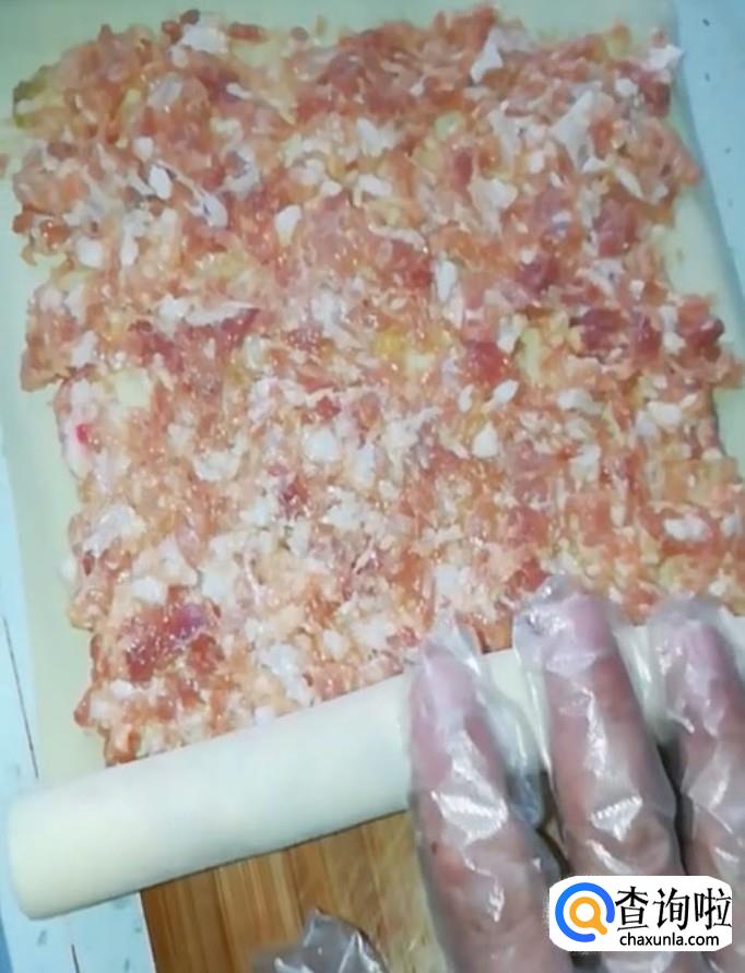 接着我们将豆腐皮铺平,在上面铺上一层调好的肉馅,用手把它卷起来