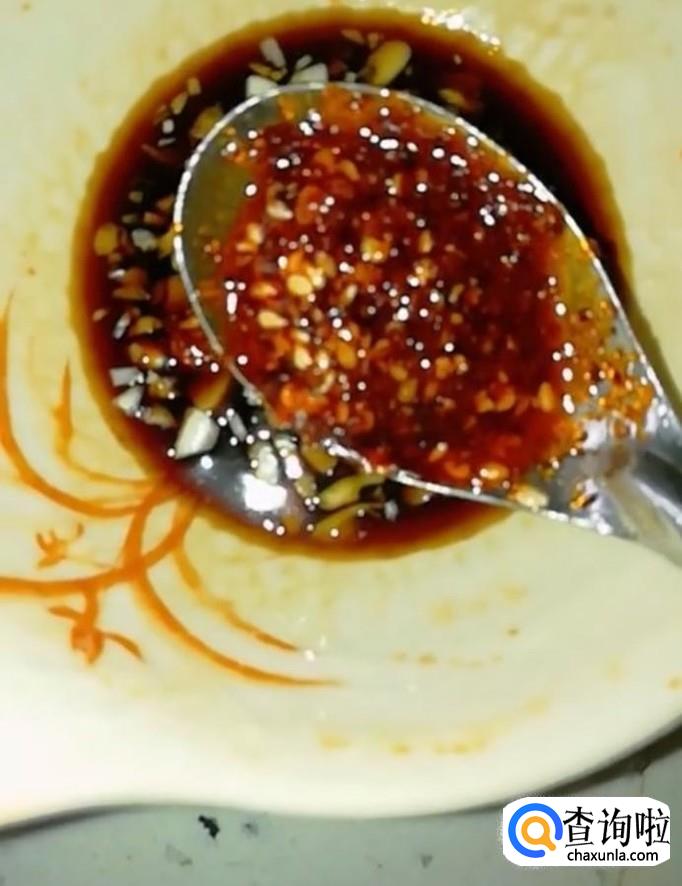 然后我们准备一个碗,碗中放入少许蒜末,生抽,陈醋,辣椒油,搅拌均匀