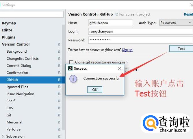 接下来我们输入github的登录名和密码,然后点击Test按钮,如果弹出如下图所示的提示框则代表账户密码配置正确