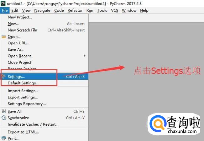 打开Pycharm软件,点击左上角的File菜单,在下拉界面中选择Settings选项,如下图所示