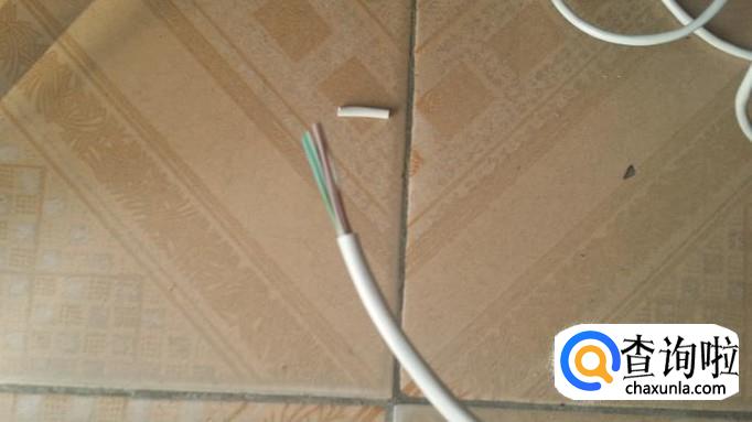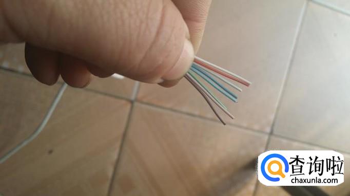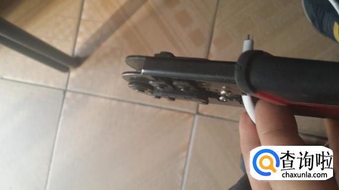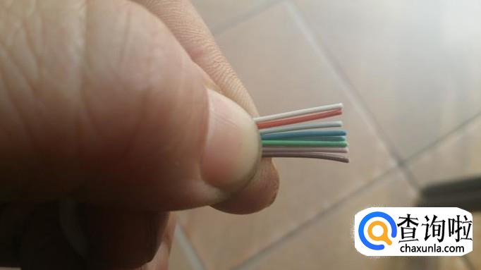 先把网线的一端进来一寸左右放进网线钳的割线刀口,如图,把网线钳压下,用手转动这一端的网线,就可以把网线外皮割下,可以看到里面有八根不同颜色的铜芯线(便宜的网线都是铝芯的)。