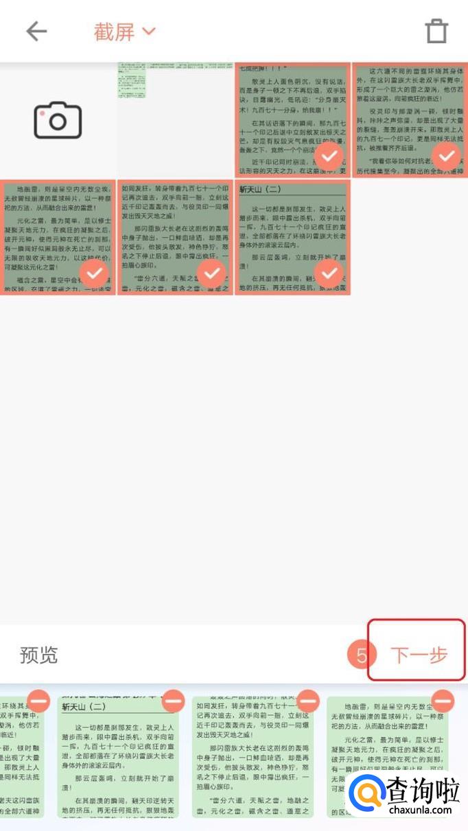 接下来就是在手机相册中,把我们准备的素材图片都选上,然后点击“下一步”。