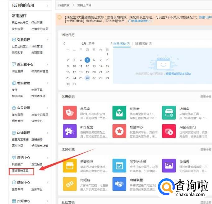 首先,进入淘宝卖家中心后台,在“我订购的应用”中找到“营销中心”,点开“店铺营销工具”。(或者在“优惠促销”中直接点击“优惠劵”)。