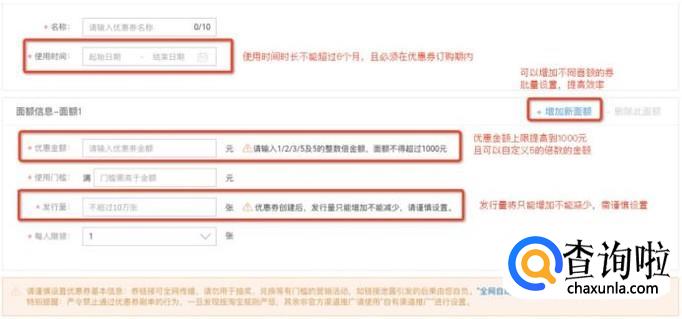 在优惠劵设置页面选择推广渠道,填写优惠劵基本信息和面额。
