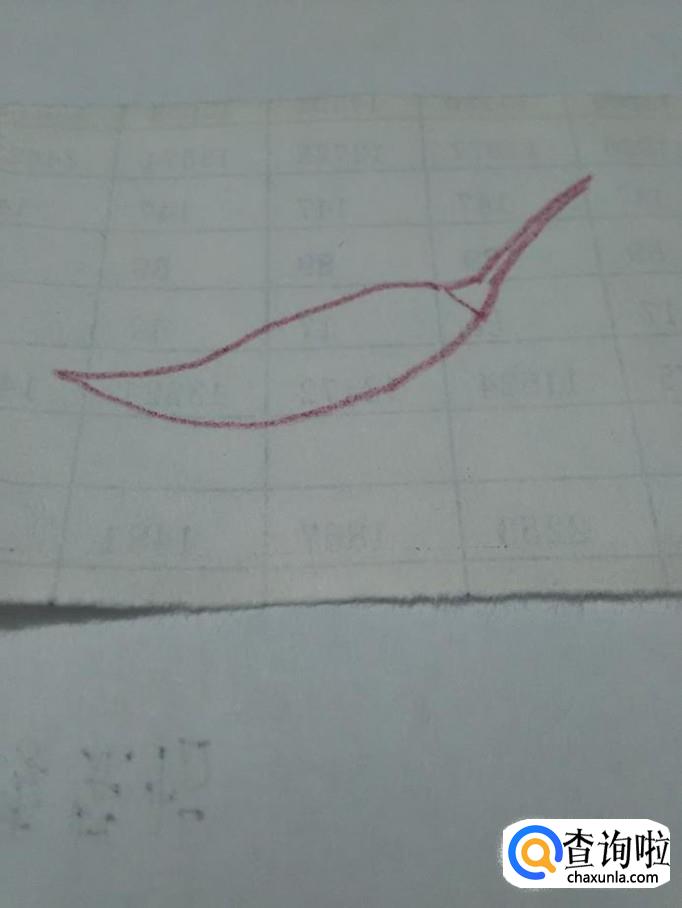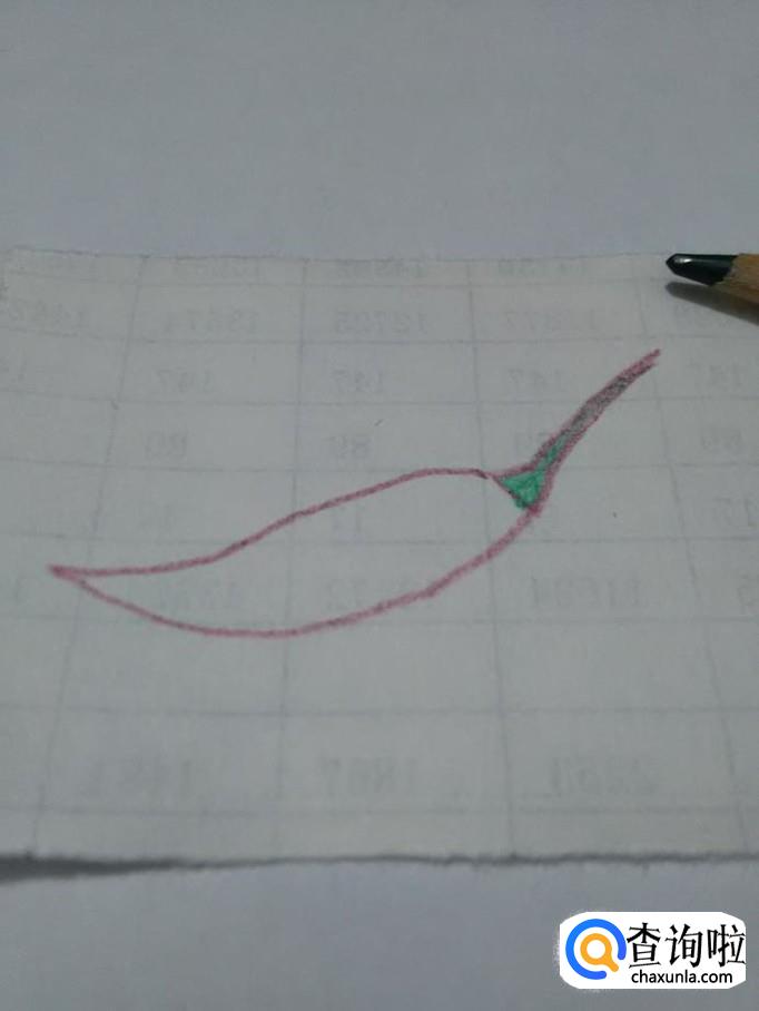 在果柄的左边画两条相交的弧线,越到左边两条弧线距离越小,最后相交在一起,这两条弧线组成辣椒的果实部分。