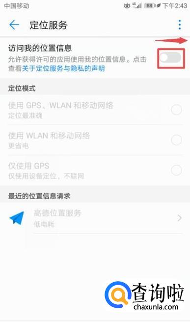 之后我们将访问我的位置信息的开关向右滑动;