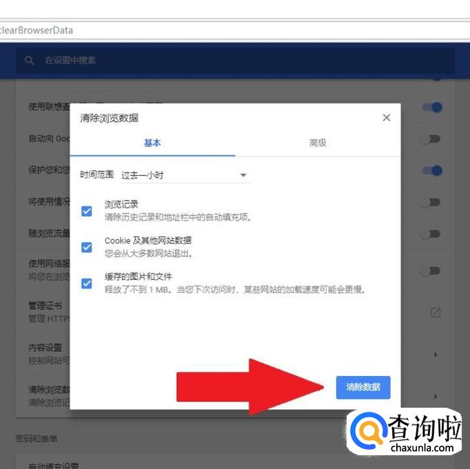 分别进入“基本”和“高级”页面勾选清除缓存的选项,最后点击“清除数据”即可清除谷歌浏览器的缓存。